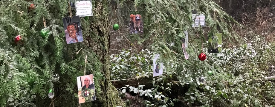 We came across the tree of remembrance on a snowy trail deep in Mundy park- a small fir tree festooned with photos -some of humans, but mostly of dogs (Mundy is an off -leash dog park) a small hand lettered sign inviting walkers to hang a photo in remembrance of someone dear, but now departed, that had walked the park with them in days gone by. The memorial was a new creation, since we walk the park frequently and had never encountered it before-doubtless it was done in the sprit of the season, since Christmas was almost upon us.